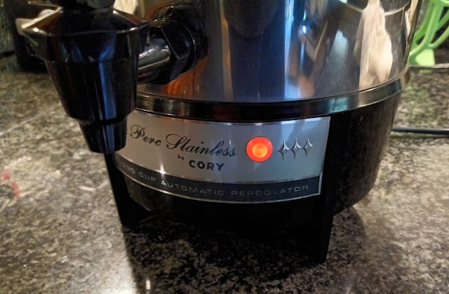 I honestly debated whether I should pick up this Cory Party "Perc". But here's what it had going for it: it's a Cory, who made very good products, but just never got as big as their competition, so there are far fewer out there. It still had the box. It was only $5. AND IT HAS A BLUE READY INDICATOR LIGHT!